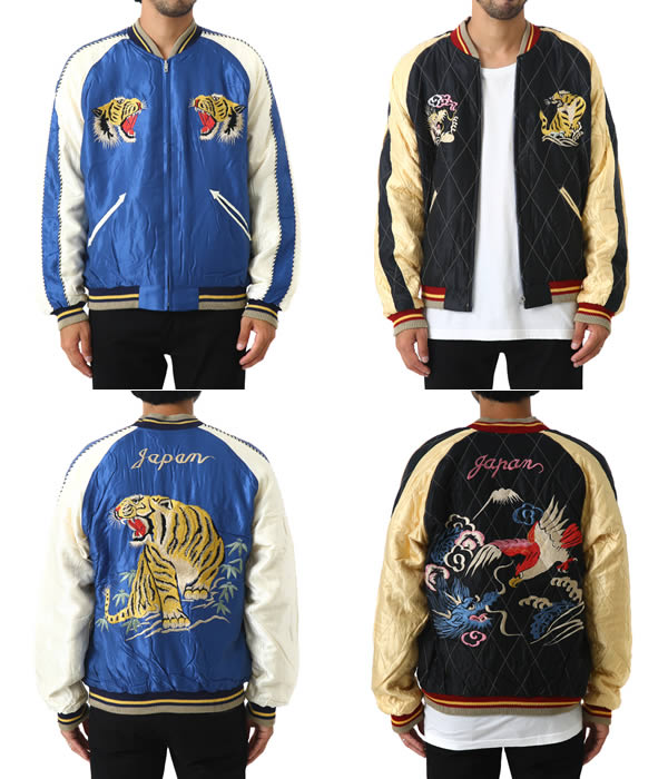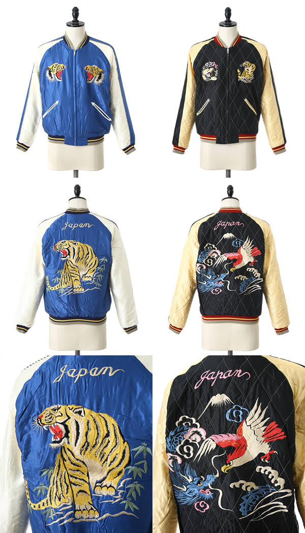商品詳細 【デザイン】 1950's Style ブルーのアセテートに咆哮する虎を描いたスカジャンの王道ともいえるデザイン。
