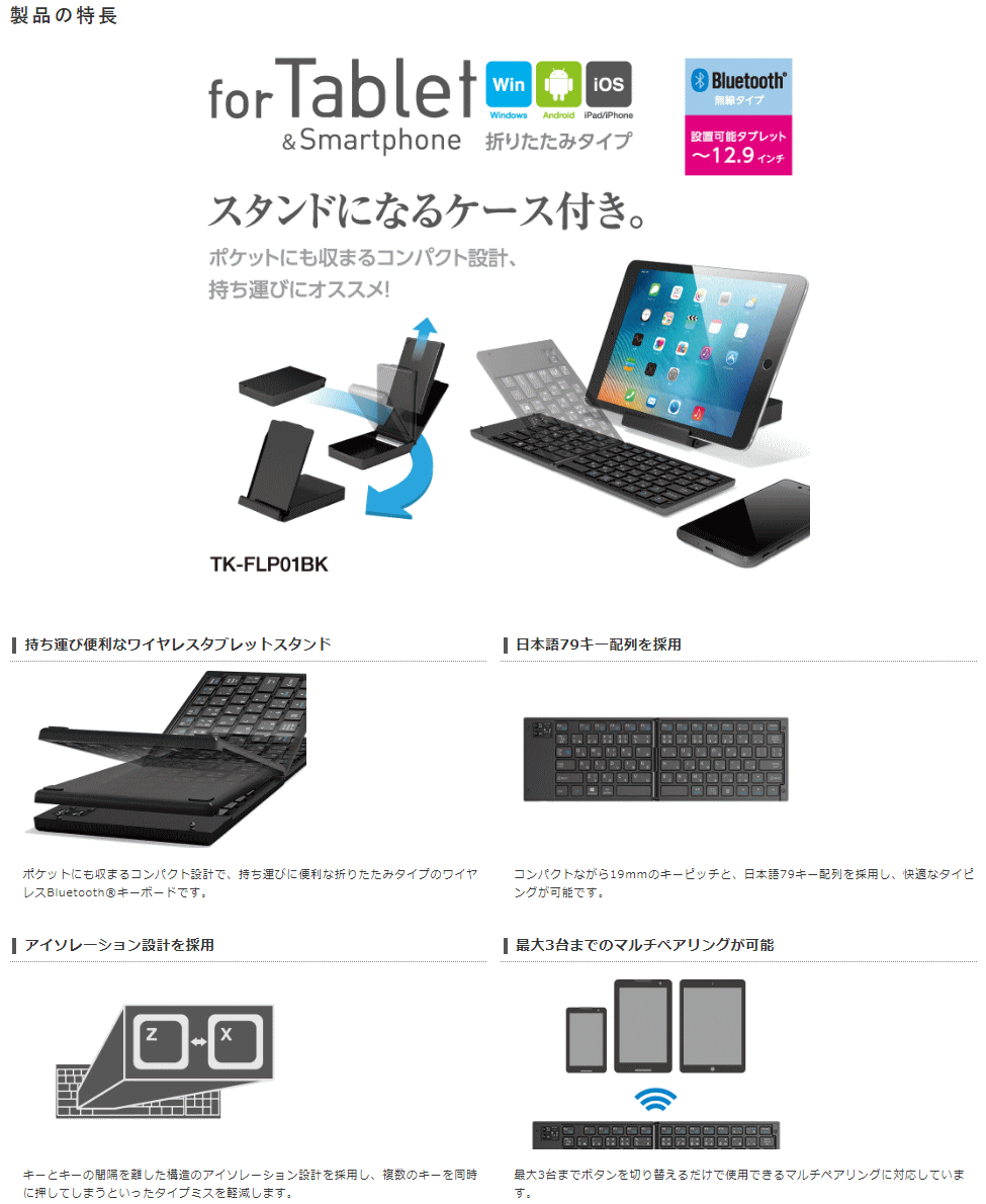 エレコム キーボード TK-FLP01BK ワイヤレスBluetooth(R) ★ポケットにも収まるコンパクト設計 スタンドになる持ち運び用保護ケース付。【あす楽】【オススメ】【セール】【即納】