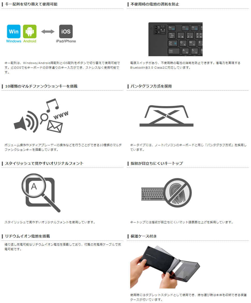 タブレットスタンドになる持ち運び用保護ケースが付いた、 折りたたみタイプのワイヤレスBluetooth(R)キーボード。