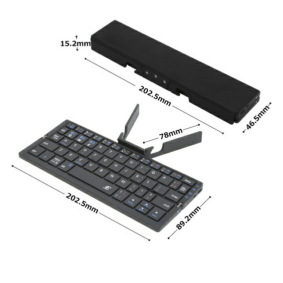 本体色:ブラック 材質:PC、ABS樹脂、アルミニウム合金、コットンフランネル(保護ポーチ) キー配列:英語配列(60キー) キーピッチ:15.5mm キー耐久回数:約300万回(キー単体回数) Bluetooth規格:3.0 Bluetooth接続距離:約10m以内マルチペアリング機能:3台 電源:リチウムポリマーバッテリー(内蔵) バッテリー容量:160mAh充電インターフェース:microUSB 充電時間:約2時間 連続使用時間:約50時間 ※使用環境により異なります 連続待受け日数:約150日 ※使用環境により異なります 製品寸法:折りたたみ時W202.5×D15.2×H46.5mm 使用時W202.5×D15.2×H89.2mm 製品重量:164g 付属品:充電用microUSBケーブル・・・1本 保護ポーチ・・・・・・・・・・1個 対応OS:Android3.0以降 / iOS5.0以降 / Windows7以降 対応機種:各種Windowsタブレット、アンドロイドタブレット スマートフォン、iPad Air、iPad mini、iPhone 特徴:・折りたたみ時サイズが幅202.5mm、高さ46.5mm、奥行15.2mmという コンパクトなスティック状ですので、バックの中でもかさばりません。