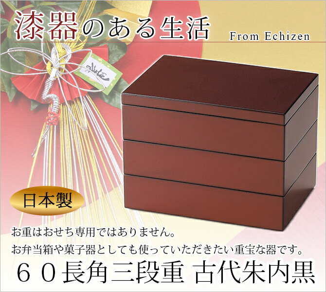 ギフト対応 商品名:60長角三段重 古代朱内黒 1014902 旬なキーワード:重箱 お重 おせち 長方形 3段 無地 木製 日本製 越前漆器 うるし 艶 上品 定番 漆器 漆塗 手塗 高級 正月 弁当 菓子器